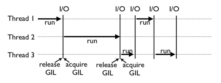 下面这张图,就是一个GIL在Python程序的工作示例。其中,Thread 1、2、3轮流执行,每一个线程在开始执行时,都会锁住GIL,以阻止别的线程执行;同样的,每一个线程执行完一段后,会释放GIL,以允许别的线程开始利用资源。