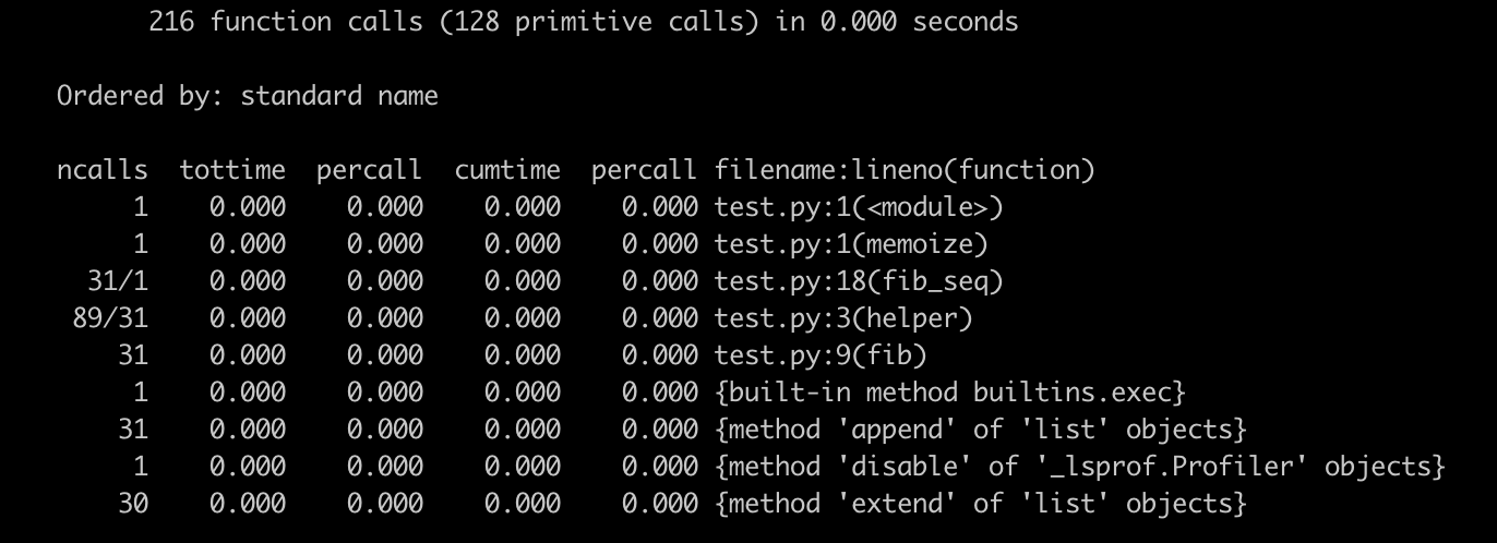 这个简单的例子,便是cProfile的基本用法,也是我今天想讲的重点。当然,cProfile还有很多其他功能,还可以结合stats类来使用,你可以阅读相应的 官方文档 来了解。