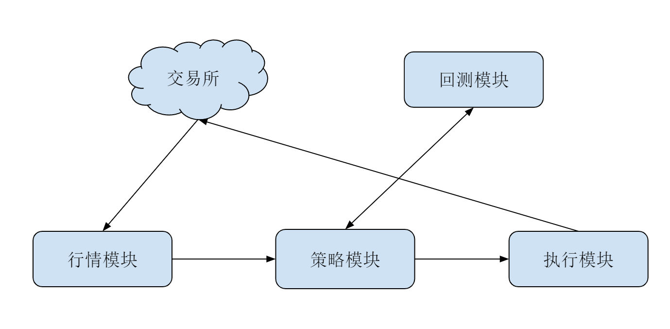 对算法交易系统来说,API只是最下层的结构。通常而言,一个基本的交易系统应该包括:行情模块、策略模块和执行模块。为了辅助策略的开发,通常还有回测系统辅助。它们的分工示意图大致如下: