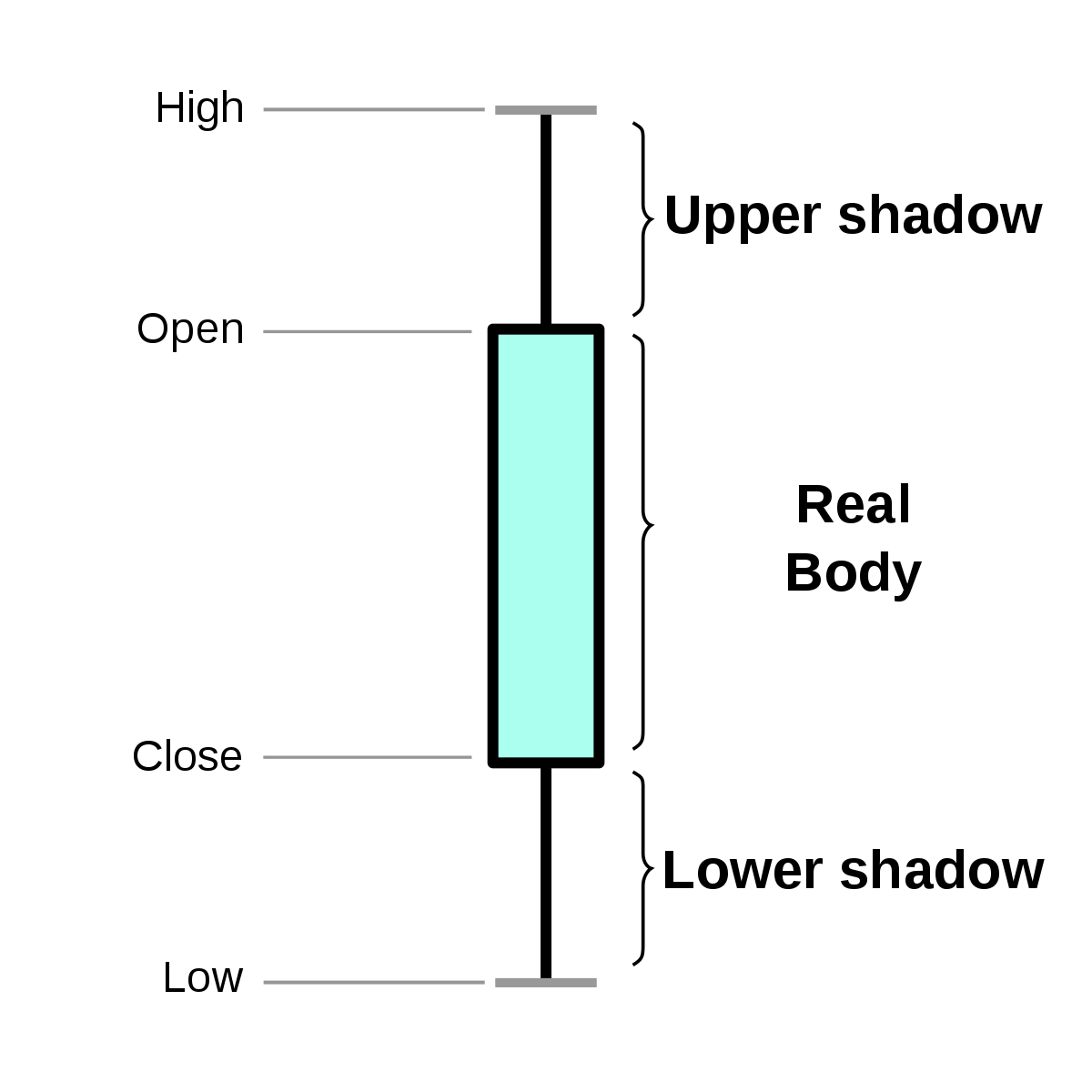 其中,每一个小蜡烛,都代表着当天的开盘价(Open)、最高价(High)、最低价(Low)和收盘价(Close),也就是我画的第二张图表示的这样。