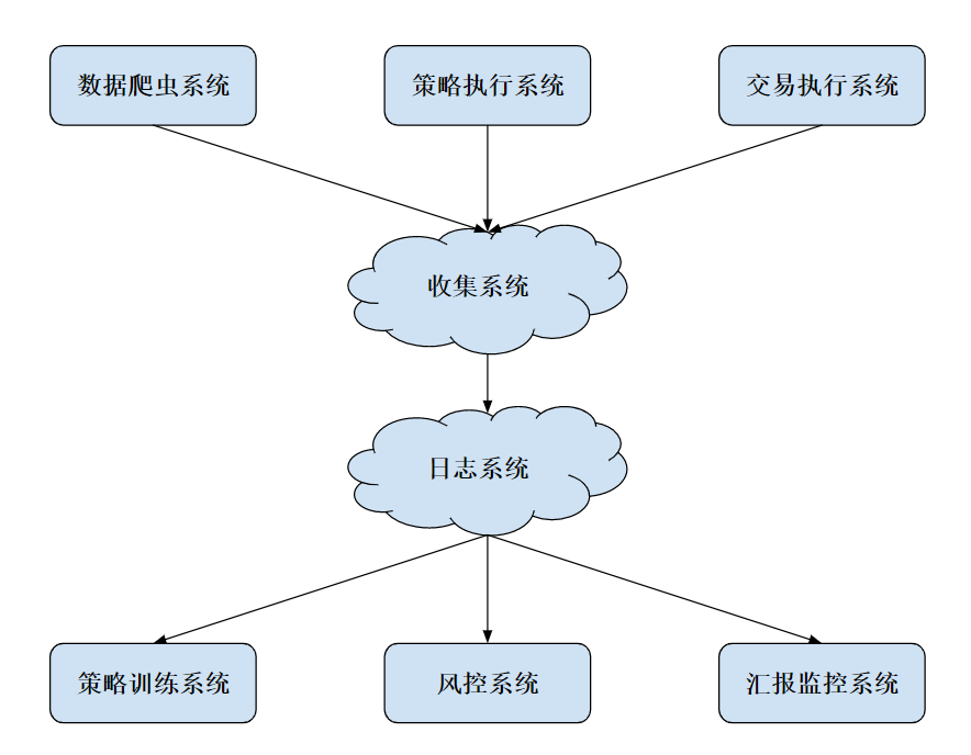 对量化交易而言,我们需要的模块主要有数据系统、策略系统、交易执行系统、线下模型训练、线上风控系统以及实时监控系统。它们之间的对应关系,我画了一张图,你可以参考来理解。