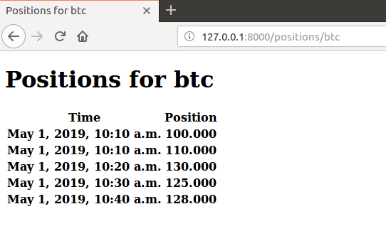 最后,输入 python manage.py runserver,然后打开浏览器输入http://127.0.0.1:8000/positions/btc,你就能看到效果啦。